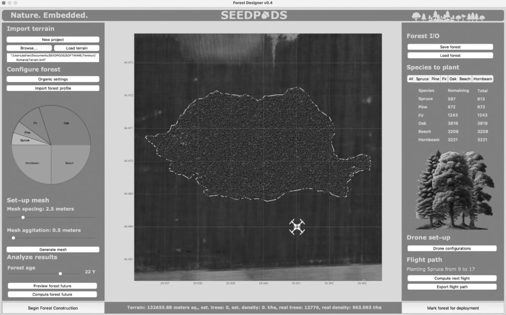 At SeedPods, we are leveraging three key innovations. First, we have designed a standardised, 3D printed tree capsule, in which seedlings can be grown from seeds at an industrial scale. Second, these standardised capsules that can cary many different species (oak, fir, spruce, pine) are deployed using robotinc tree planters, 3D custom constructed Leonardo drones. These releases their capsules from a high altitude and plants the new seedlings fast and accurate. Thirdly, we have designed the worlds first intelligent Forest Designer software. In this, we simply input a terrain geometry, we select a forest profile (Transilvanean Plateau, Industrial Pine etc) and the software automatically computes and simulates a future forest, ideal trees placement, trees percentages, and outputs drone navigation files and planting instructions. The entire process is designed to be automated, end-to-end. We design a forest in software using the mathematics that nature embedded in ecosystems, we industrially grow containerised seedlings, and we mass deploy them using the Leonardo drones.